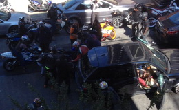 Затем байкеры окружили внедорожник, а водитель надавил на газ и уехал. Мотоциклисты бросились в погоню и попытались остановить внедорожник, но водитель, пытаясь уйти от погони, сбил еще одного байкера и уехал. Когда догнали на перекрестке, один из мотоциклистов снял с себя шлем и принялся крушить им стекла внедорожника.
