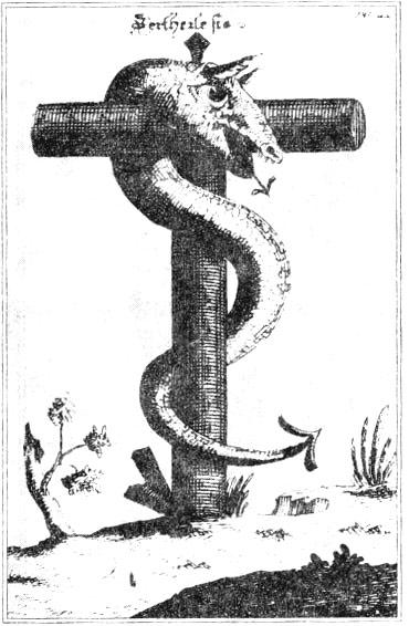 В другом изображении гексаграммы, воспроизводимом в книге оккультиста Элифаса Леви «Догма и ритуал Высокой Магии», изображены те же «единство и борьба противоположностей», но треугольники имеют уже обратное расположение: светлый треугольник сверху, чёрный внизу. Рисунок показывает борьбу двух старцев: у того, чей лик увенчан короной с крестом, чёрные руки, от которых отбиваются белые руки другого. Старец со светлым ликом и чёрными руками изображает христианство — «добро по виду и зло по делу», а другой старец – сатану – «зло по виду и добро по делу». Светлые руки сатанизма держат светлую ленту, охватывающую шею светлого старца, на которой написано: «епитрахиль Бога». Надпись на латинском языке означает: что выше – то ниже, Макропрософус (большой мир) и микропрософус (малый мир). Она воспроизводит древнюю формулу Гермеса : «Как наверху, так и внизу, как внизу, так и наверху, и нет малого и великого, а всё едино». Это пантеистическое понимание видимого материального мира как отражение мира невидимого. Чёрный треугольник символизирует погружение «духа» в воды поднебесной материи, а белый — духовный подъём[5]. Окружает гексаграмму «Символический Змей», гностический Уроборос, голова которого сомкнута с хвостом, что означает, что путь его пройден и то, что было ниже, стало выше, а то, что было прежде, стало после. Змей символизирует у гностиков высшую степень посвящения в оккультные знания («науки») и могущество магов, а в христианстве – «сборище сатанинское», предтечей антихриста, работающих над подчинением всего мира сатане. Так что это символ завершения цикла – земля становится, по мнении оккультистов, достоянием и царством сатаны или дьявола. Люциферианство созвучно греческому мифу о полубоге Прометее, так же похищающего у богов (элохимов) их тайну Творящего Огня, огня Разума, для передачи его человечеству, которое Зевс не хотел видеть богоподобным.