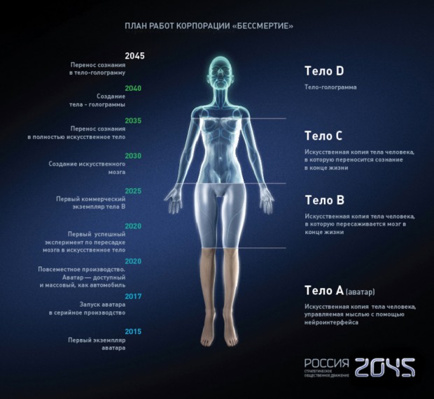 В июне этого года в Нью-Йорке прошёл Второй международный конгресс форума «Глобальное будущее 2045» (Global Future 2045), собравший учёных, инженеров, специалистов в области нейронаук, обсудивших перспективы развития кибернетических технологий для достижения бессмертия человека. Организатором и президентом форума этого проекта является российский миллиардер, гендиректор интернет-компании Newmedia Stars и основатель Стратегического общественного движения «Россия 2045» Дмитрий Ицков, изложивший своё кредо следующим образом: «Человек должен быть свободным от ограничений биологической природы, смерти, гравитации». Для этого человеческие тела должны быть заменены небиологическими носителями, в головы которых вживят мозг землян, и таким образом эволюция человечества будет направлена по пути достижения бессмертия.