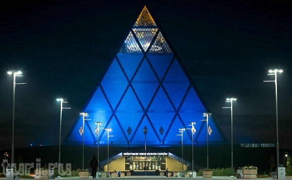 Другой формой такого «единения» являются съезды наиболее авторитетных представители ислама, христианства, иудаизма, синтоизма, индуизма и буддизма, которые проводятся в Астане и ключевой идеей которых является заменить «идеологию противостояния» на «культуру мира»[22]. Форумы проходят с 2003 г. раз в три года, при этом второй съезд состоялся уже в специально построенном для него «Дворце мира и согласия» (названном так по аналогии с «Храмом понимания»), архитектура которого говрит сама за себя. Это масонская пирамида со светящимся верхом, представляющая собой «храм» поклонения культу солнца. Внутреннее устройство её включает три уровня: тёмный подвальный этаж, где размещён оперный театр (для непросвещённого народа); средний уровень — конференцзал с громадной фигурой солнца, где заседяют «просвещённые» лидеры, обсуждающие проблемы, препятствующие установлению Новой Эры; наконец, вершина, представляющая достижение «просветления» на индивидуальном и мировом уровне[23].