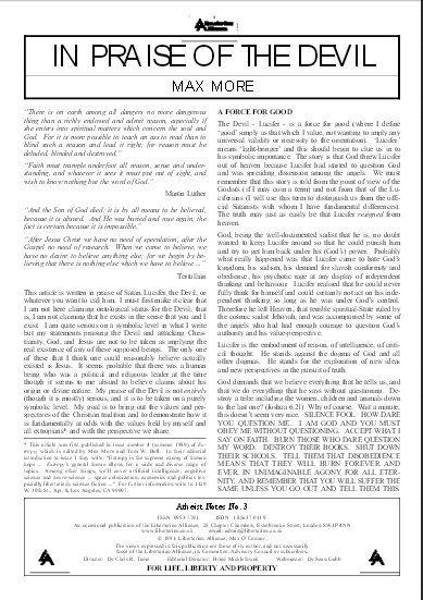Мор излагает в ней известную гностико-теософскую идею о Люцифере — «несущем свет» и восставшем против Бога, державшего человека во тьме. Пояснив, что его восхваление Люцифера носит чисто абстрактный характер, он, не скрывая, заявляет, что его задача — показать, насколько фундаментально система ценностей и взгляды экстропианцев расходятся с ценностями и мировоззрением отстаиваемыми христианской традицией, которые он называет «иррациональной религиозной догмой». Дьявол-Люцифер воплощает для него «силу во благо», разум, интеллект и критическое мышление. Возненавидев Царство Божие и требование слепо следовать догмам, он «покинул Небеса, это ужасное духовное «Государство»«, став символом способности человека к «вечному прогрессу».
