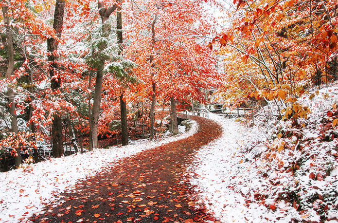 Существует лишь один краткий момент в зимнем периоде – так называемая зимоосень, который бывает лишь один раз в несколько лет, когда первый снег сочетается со всеми красками осени. Когда осень и зима мимилетно сливаются воедино.