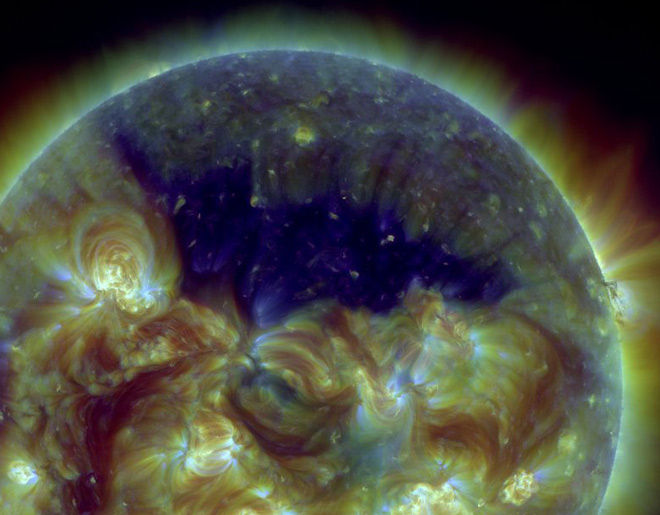 Корональные дыры ― области в верхних слоях солнечной атмосферы, где силовые линии магнитного поля расходятся и солнечный ветер свободно истекает в космическое пространство. Данное обстоятельство вызывает магнитные бури на орбите Земли.