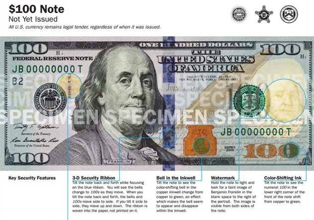 Стодолларовая купюра, самая крупная в США, претерпела перемены ради повышения защиты от фальшивомонетчиков, гласит официальная версия ФРС. Ранее дизайн, системы защиты меняли у более мелких заокеанских купюр в 5, 10, 20, 50 баксов. По версии же ряда конспирологов, введя новую стобаксовую банкноту, власти США смогут устроить всякие нехорошие сюрпризы для владельцев старых стодолларовых бумажек, так как этих зеленых бумажек очень много развелось за пределами США.