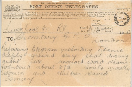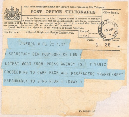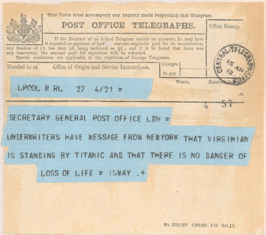 101 год назад, в ночь с 14 на 15 апреля 1912 года, «Титаник» столкнулся с айсбергом и затонул. В первые минуты после столкновения масштаб катастрофы еще не прояснился, поэтому телеграммы, отправлявшиеся владевшей судном фирмой «Исмей, Имри и Компани», были полны оптимизма. «Генеральному секретарю Почтового офиса — По сообщению из Нью-Йорка, „Вирджиниан“ находится рядом с „Титаником“ и там нет опасности для жизни», гласило первое сообщение.