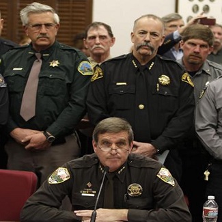 Шериф округа Уэлд Джон Кук при поддержке группы шерифов выступает против закона о контроле за оружием в здании законодательного собрания штата Колорадо 4 марта 2013 года.